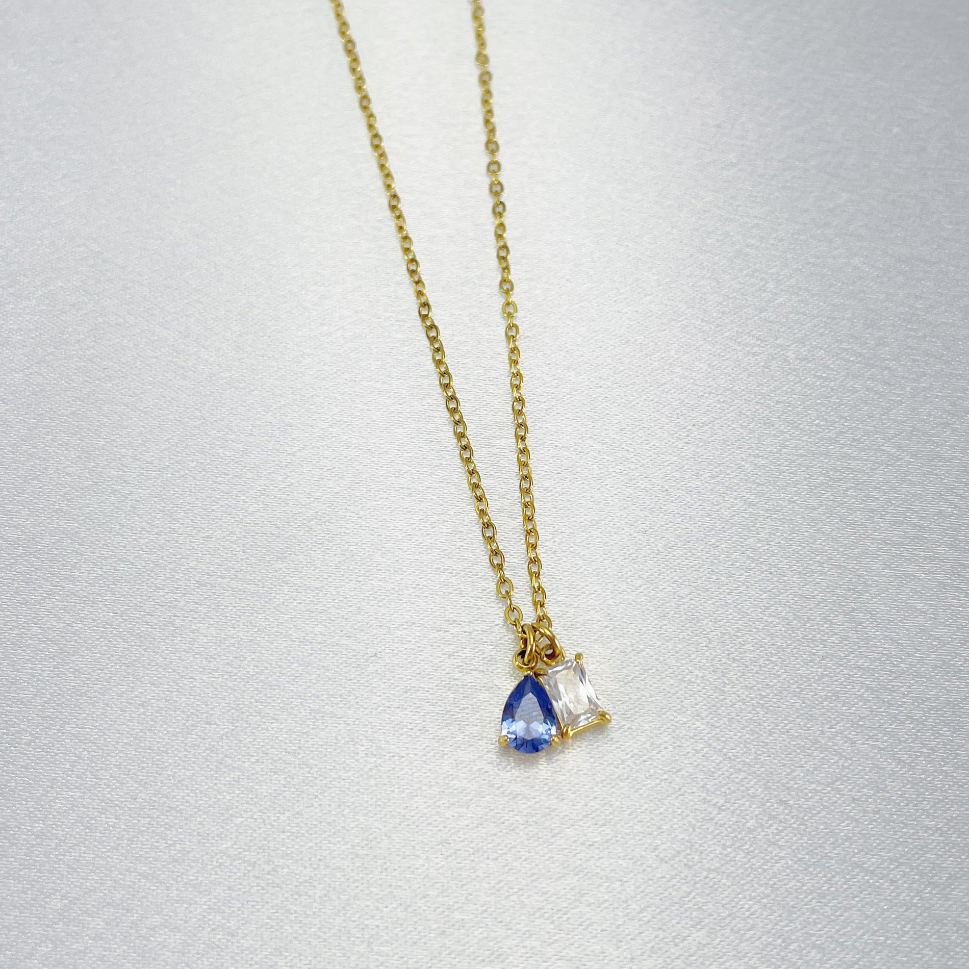 Featuring a pear-cut zirconia and an emerald-cut zirconia, this necklace is personalized with two birthstones to represent you and your partner.
