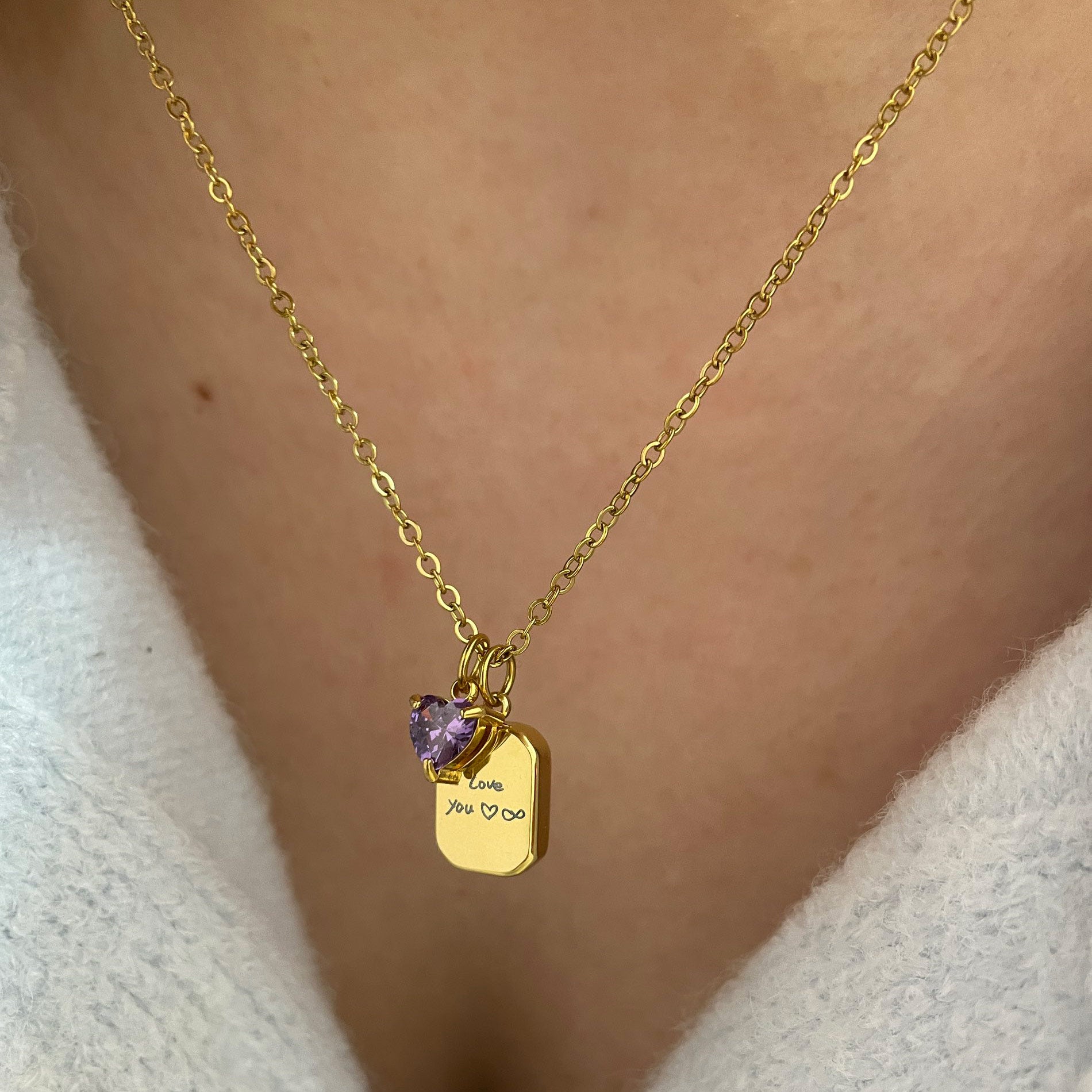 Our Engraved Handwriting Necklace transforms meaningful handwriting or drawings into a timeless keepsake. Simply upload a clear photo of handwritten words, a signature, or a small sketch, and our artisans will carefully engrave it onto a sleek rectangular pendant. A sparkling anniversary birthstone adds a personal touch that represents your special month.
